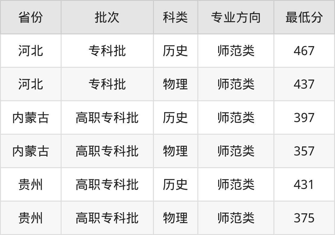 陕西青年职业学院小学教育专业录取分数线从357分到467分不等,最低分数线如下: