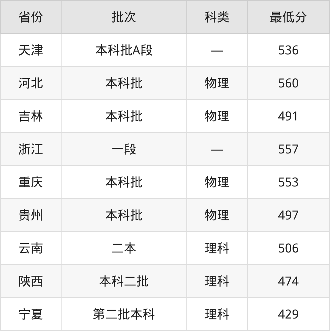北华大学计算机科学与技术专业在全国各省最低录取分数线为429分(宁夏理科),除此之外,在其余地区的最低分为浙江557分、重庆物理类553分、贵州物理类497分、天津536分等,以上数据均为2024年数据,供2025年高考生参考。