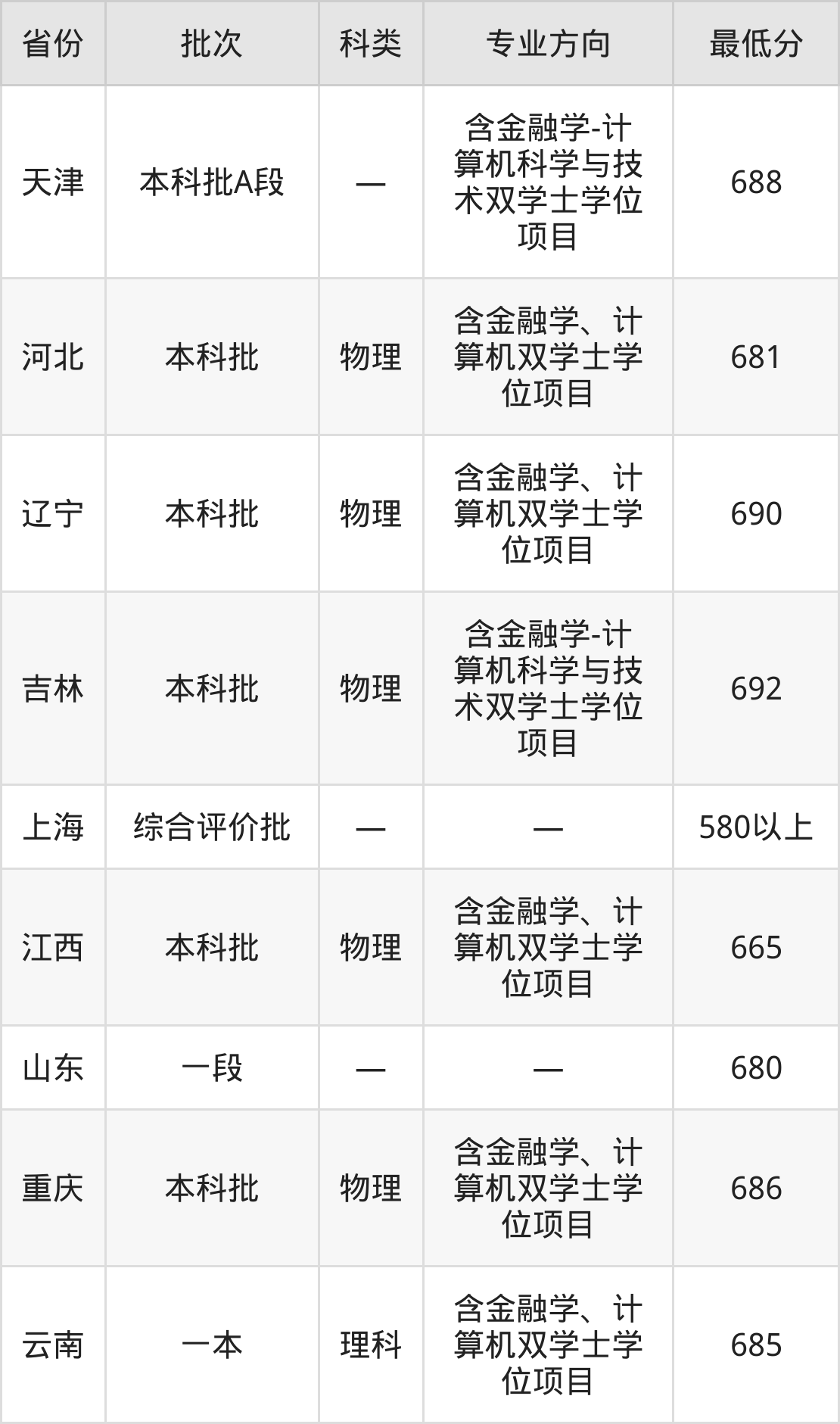 上海交通大学金融学专业录取分数线从580分到692分不等,最低分数线如下: