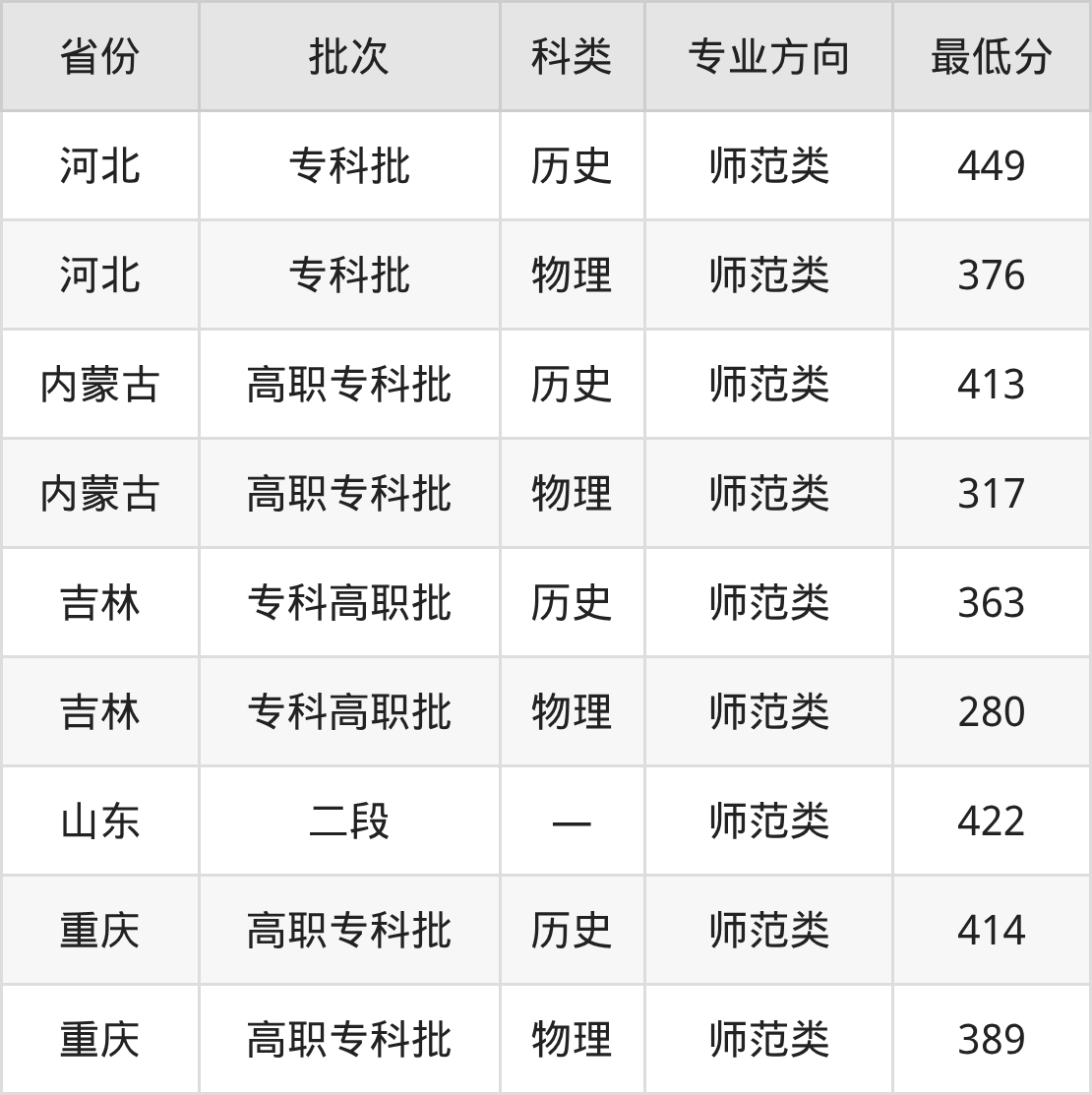 湖北职业技术学院学前教育专业录取分数线从280分到449分不等,最低分数线如下: