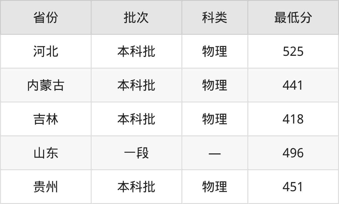 吉林化工大学工程管理专业在全国各省最低录取分数线为418分(吉林物理类),除此之外,在其余地区的最低分为贵州物理类451分、河北物理类525分、内蒙古物理类441分、山东496分,以上数据均为2025年数据,供2026年高考生参考。