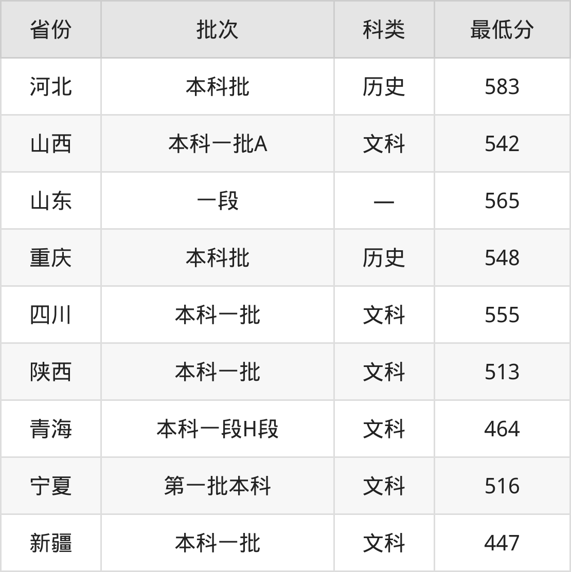 石河子大学政治学与行政学专业在全国各省录取分数线: