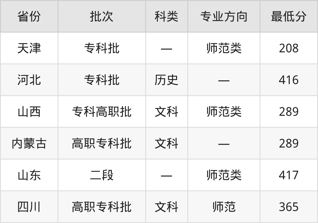 山东商务职业学院学前教育专业录取分数线从208分到417分不等,最低分数线如下: