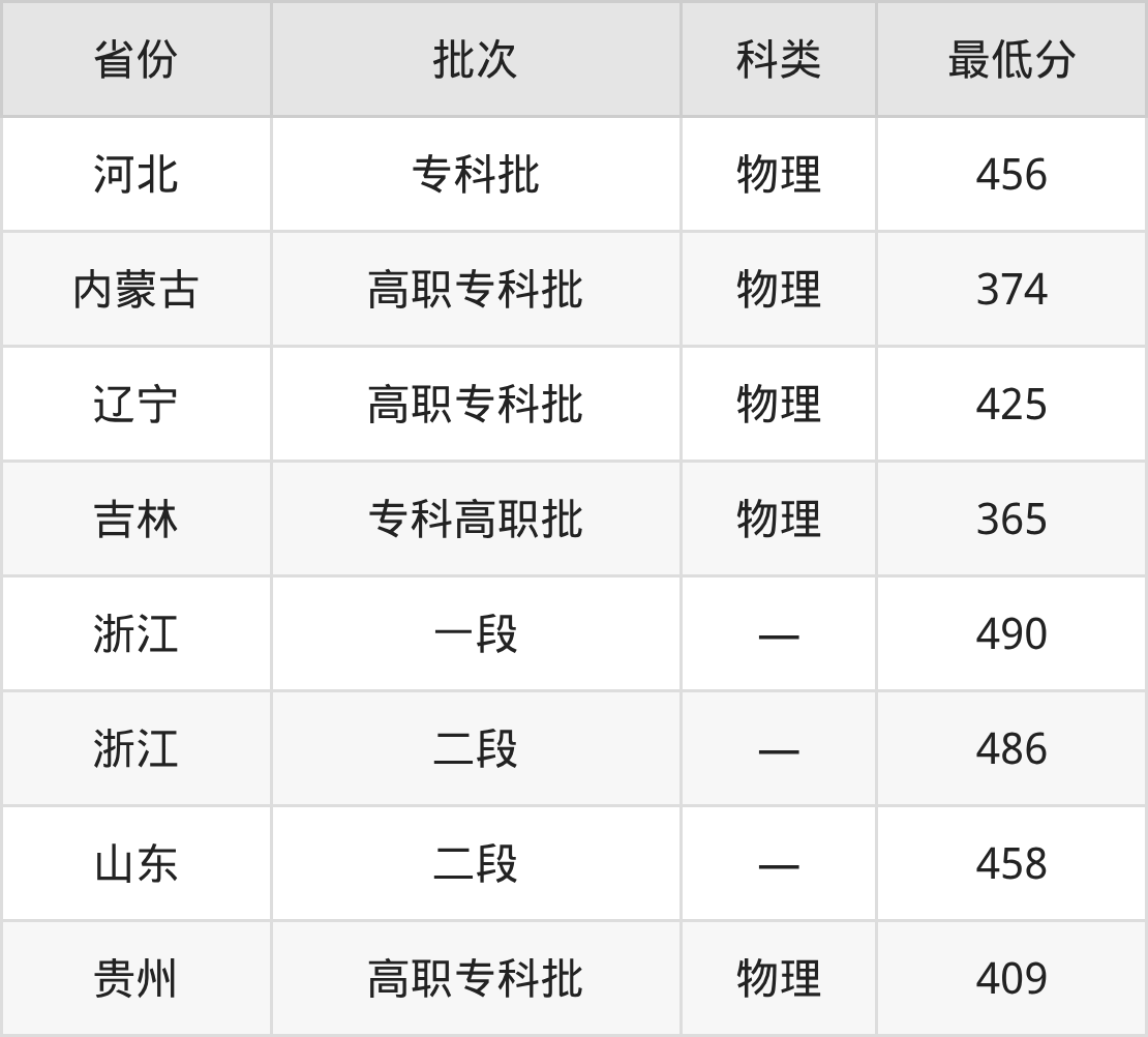 江西医学高等专科学校中医学专业在全国各省最低录取分数线为365分(吉林物理类),除此之外,在其余地区的最低分为河北物理类456分、内蒙古物理类374分、辽宁物理类425分、浙江486分等,以上数据均为2025年数据,供2026年高考生参考。