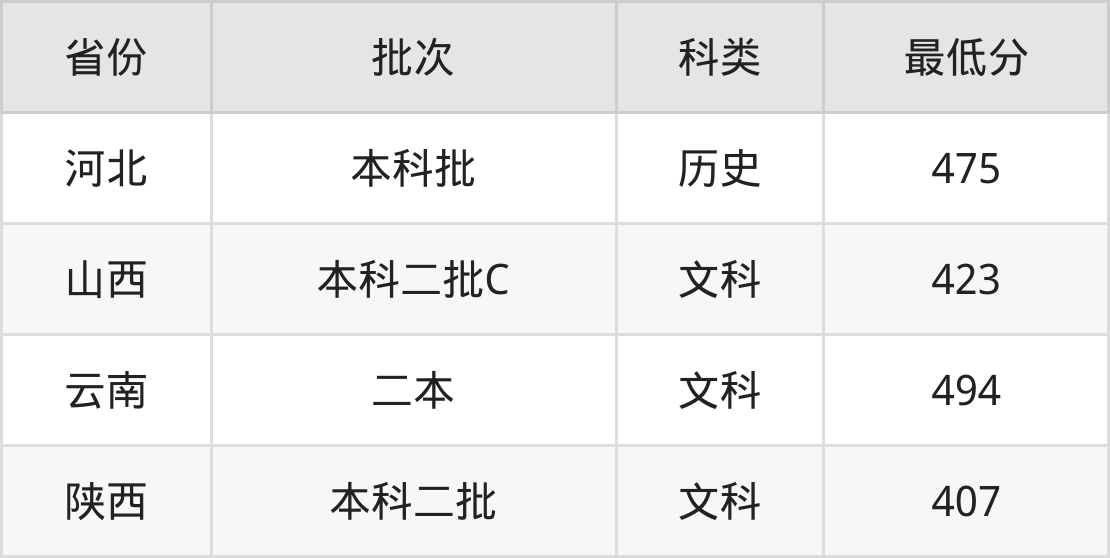 华南农业大学珠江学院汉语言文学专业录取分数线从407分到494分不等,最低分数线如下: