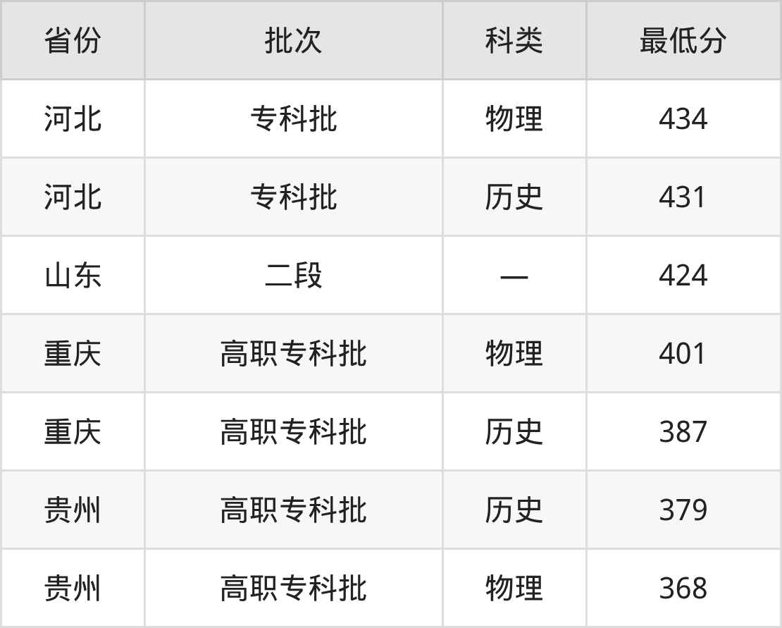鄂州职业大学计算机应用技术专业在全国各省最低录取分数线为368分(贵州物理类),除此之外,在其余地区的最低分为河北历史类431分、山东424分、重庆历史类387分,以上数据均为2025年数据,供2026年高考生参考。