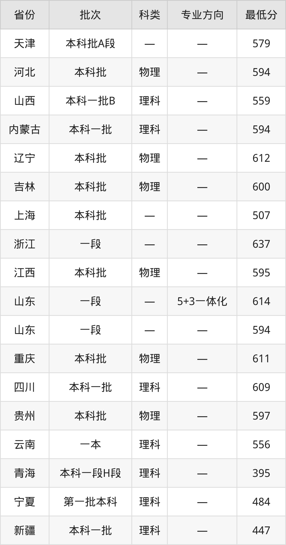 福建医科大学临床医学专业在全国各省最低录取分数线为395分(青海理科),除此之外,在其余地区的最低分为山西理科559分、山东594分、四川理科609分、云南理科556分等,以上数据均为2024年数据,供2025年高考生参考。