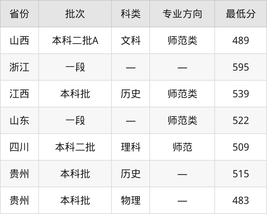 泉州师范学院地理科学专业在全国各省最低录取分数线为483分(贵州物理类),除此之外,在其余地区的最低分为山西文科489分、浙江595分、江西历史类539分、山东522分等,以上数据均为2024年数据,供2025年高考生参考。
