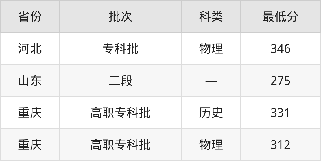 重庆电信职业学院铁道车辆技术专业录取分数线从275分到346分不等,最低分数线如下: