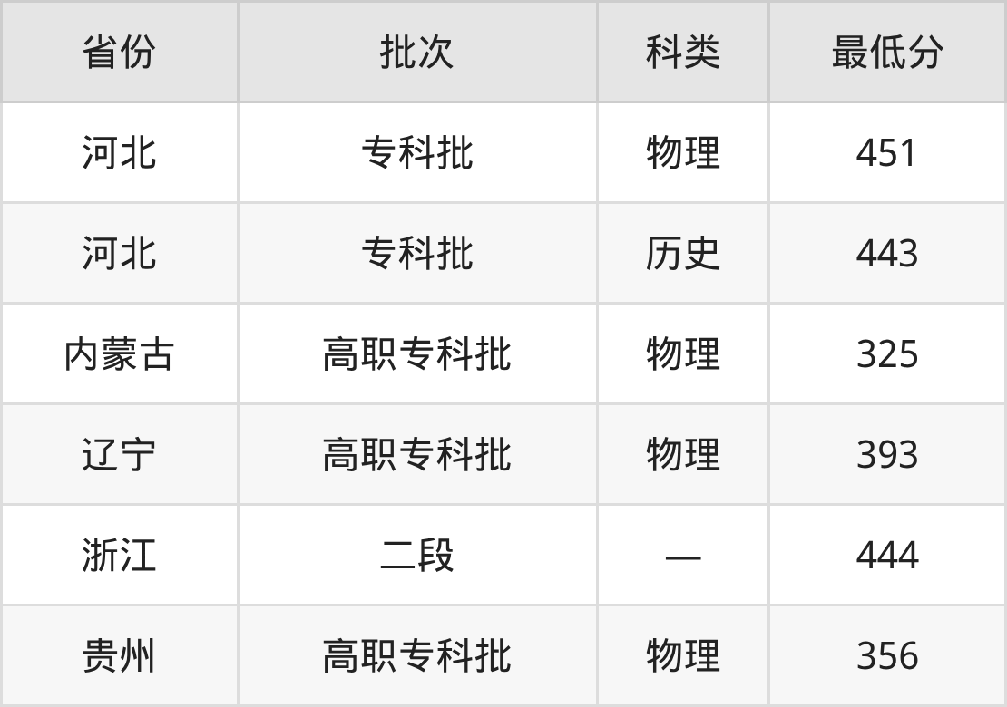 天津工业职业学院工业机器人技术专业在全国各省最低录取分数线为325分(内蒙古物理类),除此之外,在其余地区的最低分为浙江444分、贵州物理类356分、河北历史类443分、辽宁物理类393分,以上数据均为2025年数据,供2026年高考生参考。