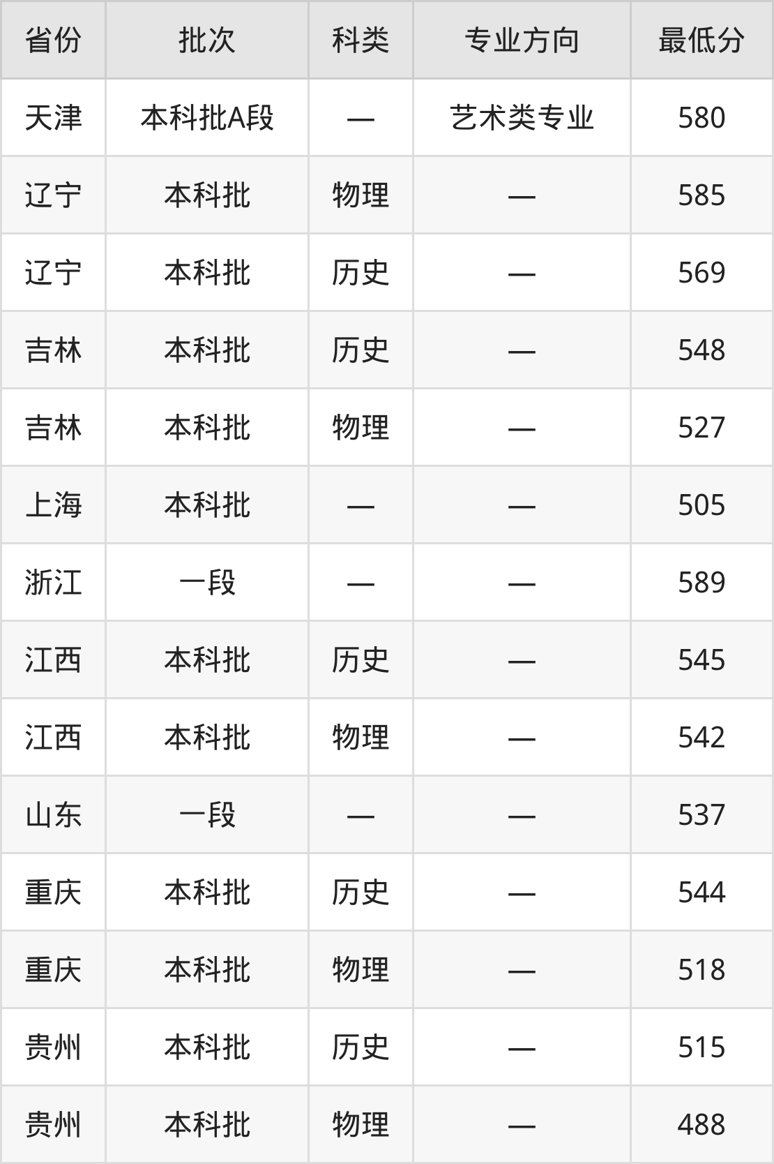 浙江传媒学院戏剧影视文学专业在全国各省录取分数线:
