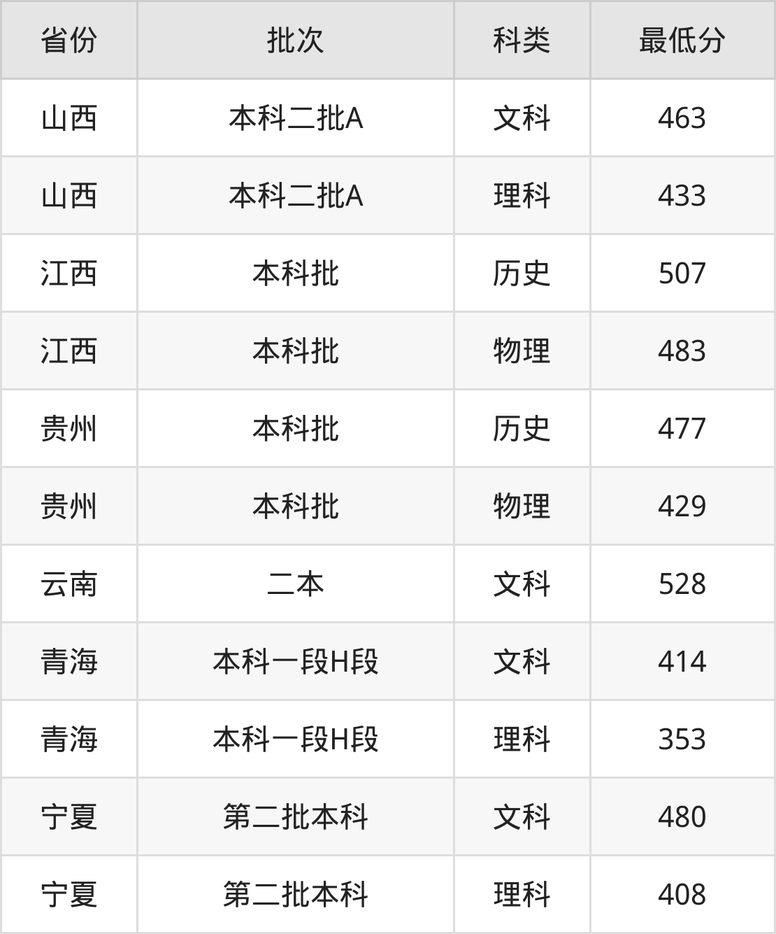 兰州城市学院酒店管理专业在全国各省最低录取分数线为353分(青海理科),除此之外,在其余地区的最低分为山西理科433分、江西物理类483分、贵州物理类429分、云南文科528分等,以上数据均为2024年数据,供2025年高考生参考。