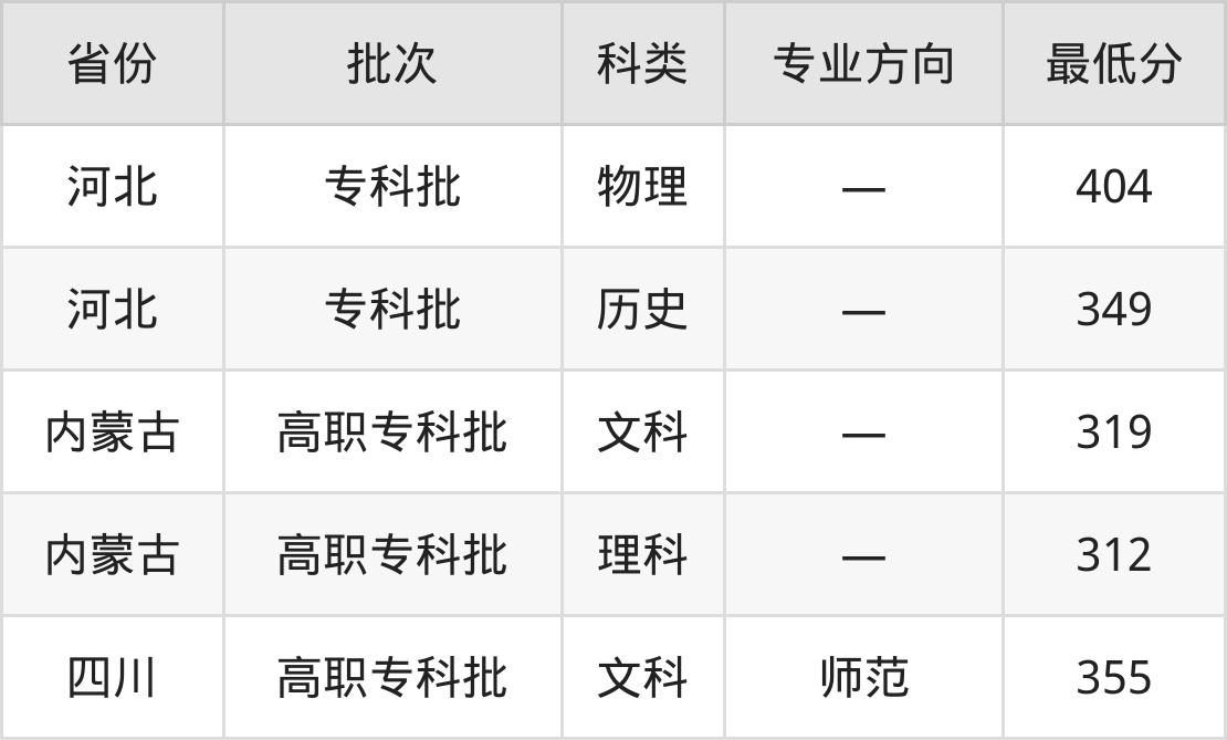 呼和浩特职业学院学前教育专业录取分数线从312分到404分不等,最低分数线如下: