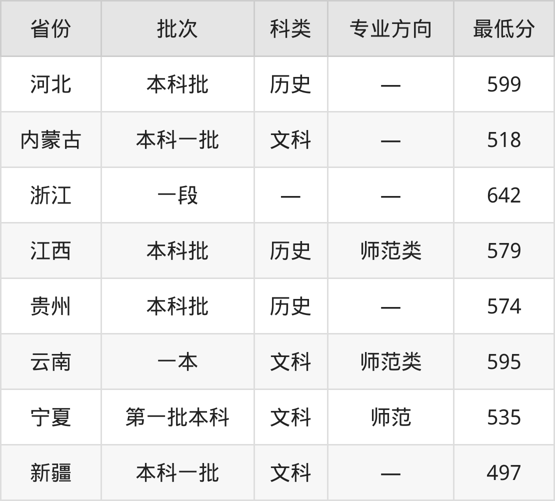 扬州大学历史学专业在全国各省最低录取分数线为497分(新疆文科),除此之外,在其余地区的最低分为河北历史类599分、内蒙古文科518分、浙江642分、江西历史类579分等,以上数据均为2024年数据,供2025年高考生参考。