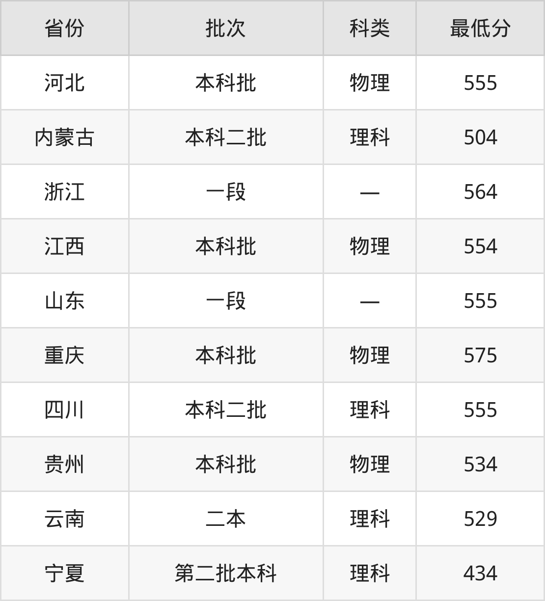 嘉兴大学临床医学专业在全国各省最低录取分数线为434分(宁夏理科),除此之外,在其余地区的最低分为河北物理类555分、内蒙古理科504分、浙江564分、山东555分等,以上数据均为2024年数据,供2025年高考生参考。