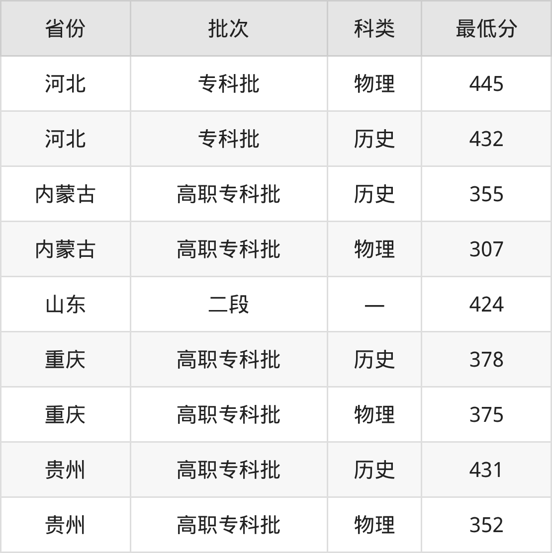 哈尔滨科学技术职业学院城市轨道交通运营管理专业在全国各省最低录取分数线为307分(内蒙古物理类),除此之外,在其余地区的最低分为河北历史类432分、山东424分、重庆物理类375分、贵州物理类352分,以上数据均为2025年数据,供2026年高考生参考。