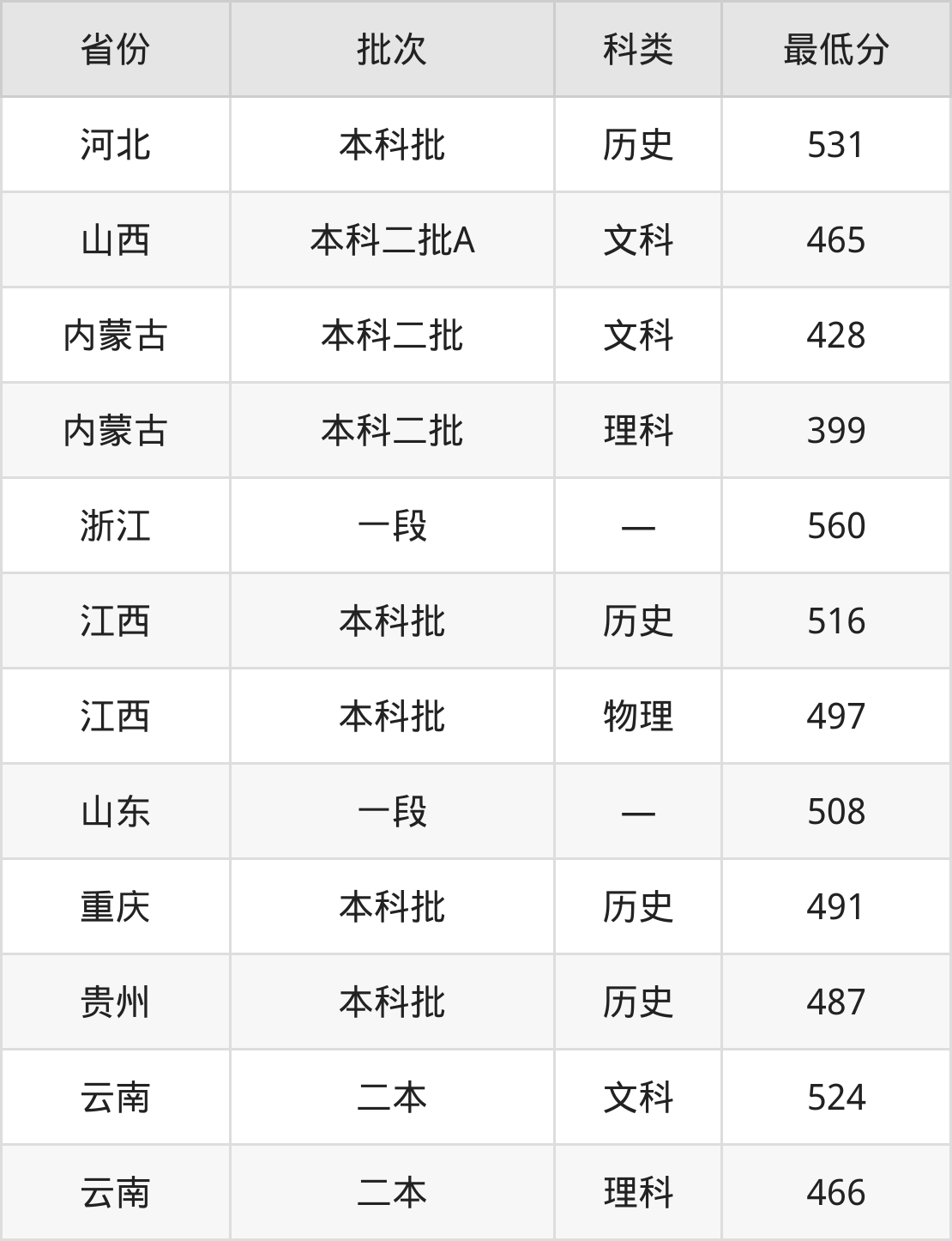 内蒙古科技大学市场营销专业在全国各省最低录取分数线为399分(内蒙古理科),除此之外,在其余地区的最低分为河北历史类531分、浙江560分、江西物理类497分、山东508分等,以上数据均为2024年数据,供2025年高考生参考。