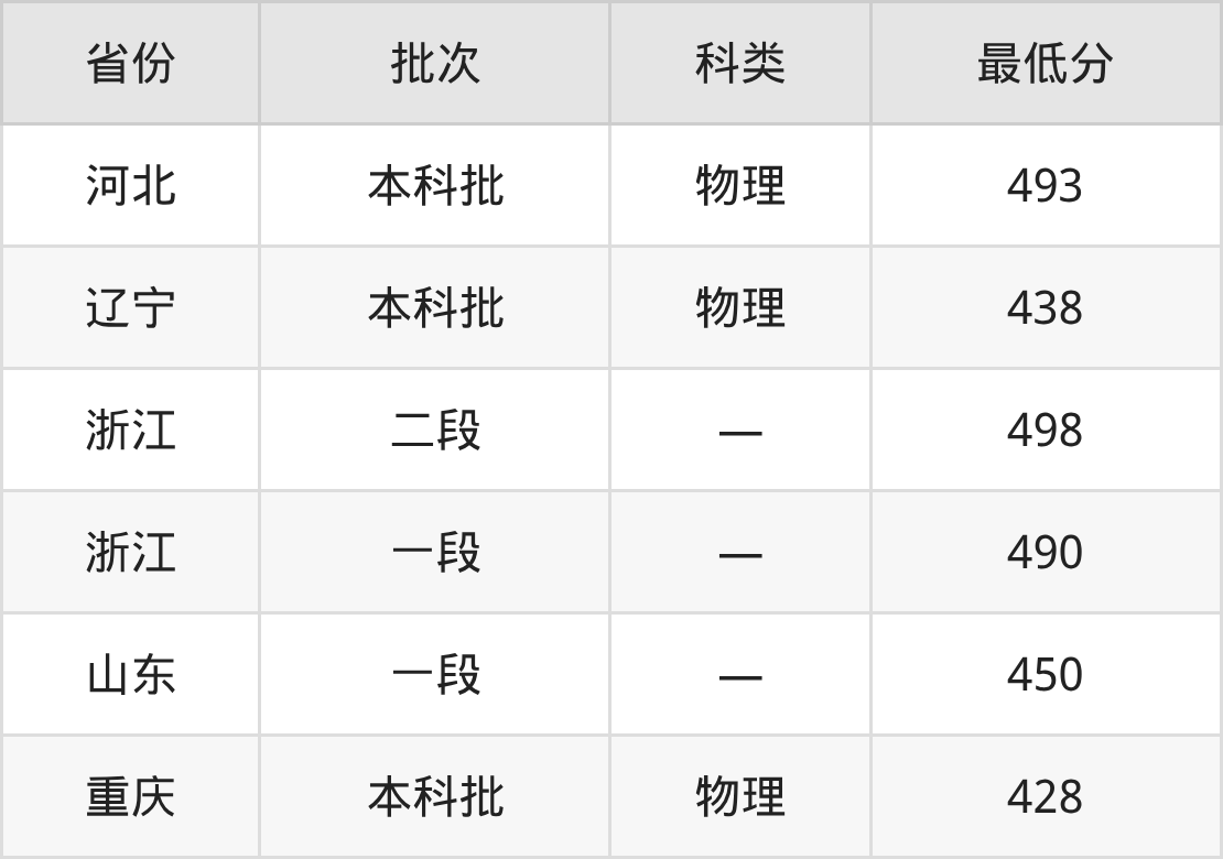山东现代学院数据科学与大数据技术专业在全国各省最低录取分数线为428分(重庆物理类),除此之外,在其余地区的最低分为河北物理类493分、辽宁物理类438分、浙江490分、山东450分等,以上数据均为2025年数据,供2026年高考生参考。