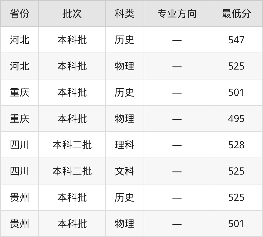 长江师范学院新闻传播学类专业在全国各省最低录取分数线为495分(重庆物理类),除此之外,在其余地区的最低分为四川文科525分、贵州物理类501分、河北物理类525分,以上数据均为2024年数据,供2025年高考生参考。