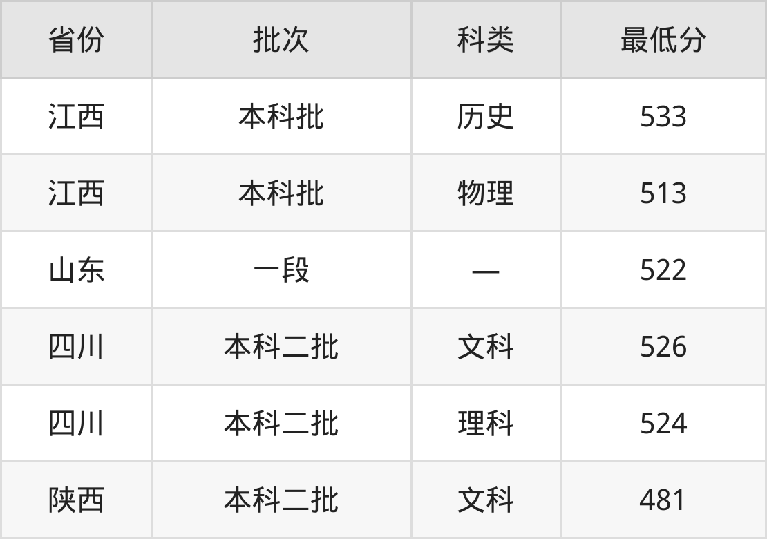 成都师范学院贸易经济专业在全国各省最低录取分数线为481分(陕西文科),除此之外,在其余地区的最低分为江西物理类513分、山东522分、四川理科524分,以上数据均为2024年数据,供2025年高考生参考。