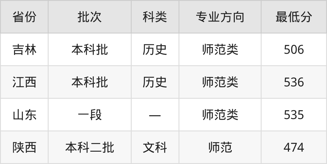 洛阳师范学院历史学专业录取分数线从474分到536分不等,最低分数线如下: