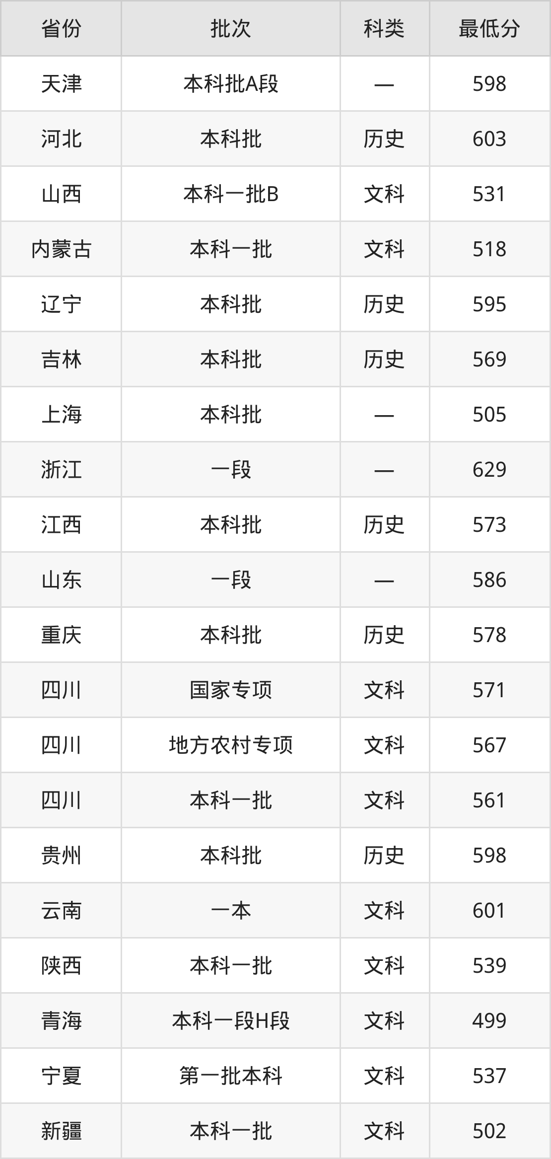 四川师范大学汉语言文学专业录取分数线从499分到629分不等,在部分地区的最低分数线如下:
