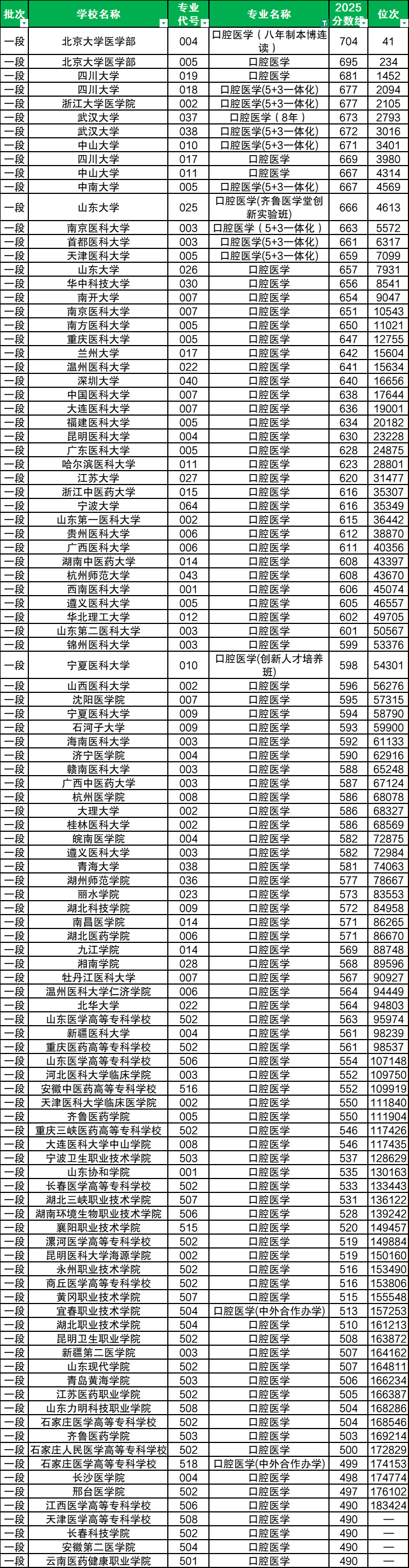 2025口腔医学录取分数线范围在490分-704分之间,各大学最低分详情如下:安徽第二医学院490分、北京大学医学部695分、南京医科大学651分、齐鲁医药学院503分等。