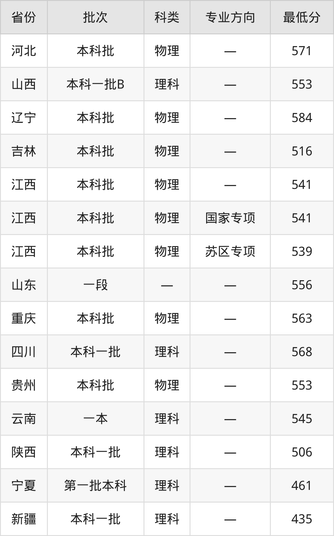 东华理工大学核工程类专业录取分数线从435分到584分不等,在部分地区的最低分数线如下: