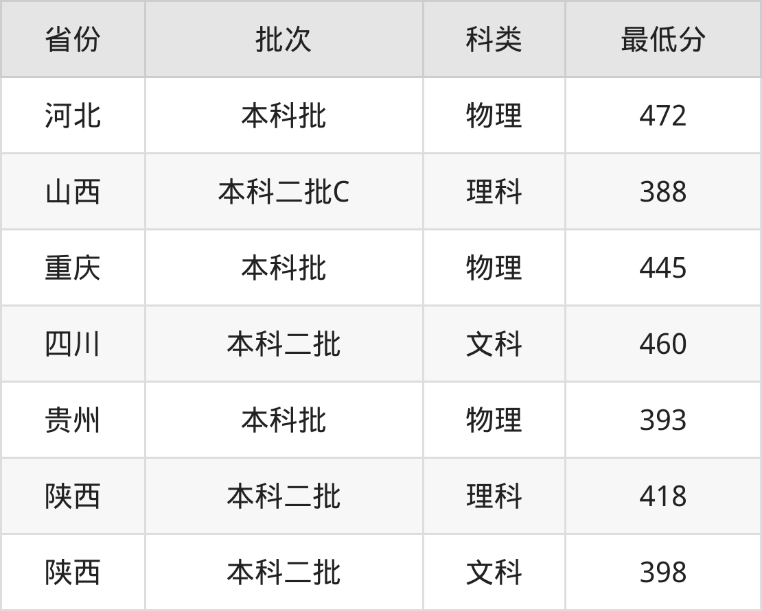 西安科技大学高新学院工程造价专业在全国各省最低录取分数线为388分(山西理科),除此之外,在其余地区的最低分为河北物理类472分、重庆物理类445分、四川文科460分、贵州物理类393分等,以上数据均为2024年数据,供2025年高考生参考。