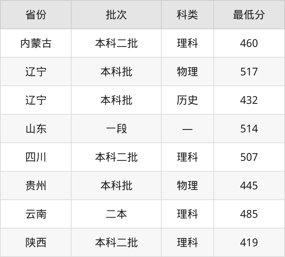 大连大学助产学专业在全国各省最低录取分数线为419分(陕西理科),除此之外,在其余地区的最低分为内蒙古理科460分、辽宁历史类432分、山东514分、四川理科507分等,以上数据均为2024年数据,供2025年高考生参考。