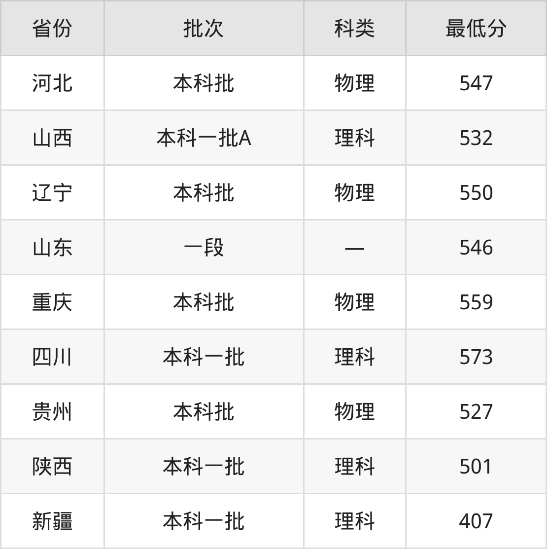 石河子大学动物医学专业在全国各省最低录取分数线为407分(新疆理科),除此之外,在其余地区的最低分为辽宁物理类550分、重庆物理类559分、四川理科573分、贵州物理类527分等,以上数据均为2024年数据,供2025年高考生参考。