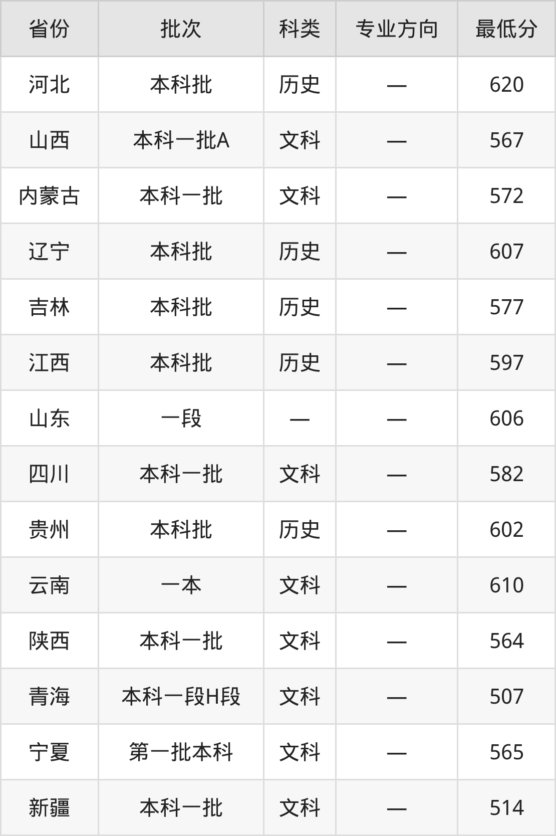 西北大学中国语言文学类专业录取分数线从507分到620分不等,在部分地区的最低分数线如下: