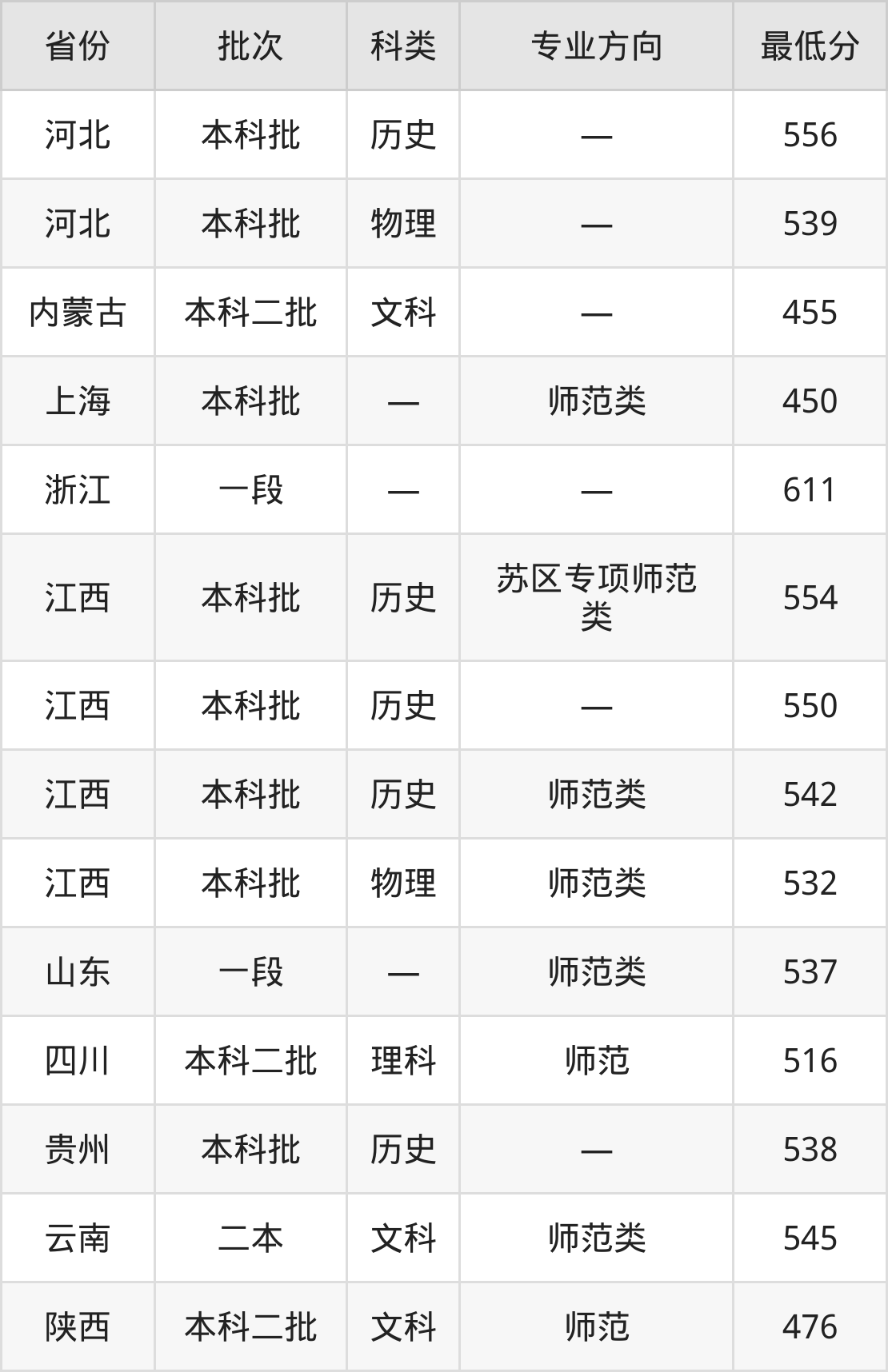 赣南师范大学小学教育专业在全国各省录取分数线: