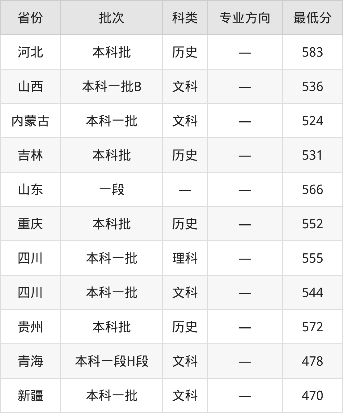 西南科技大学法学类专业录取分数线从470分到583分不等,最低分数线如下: