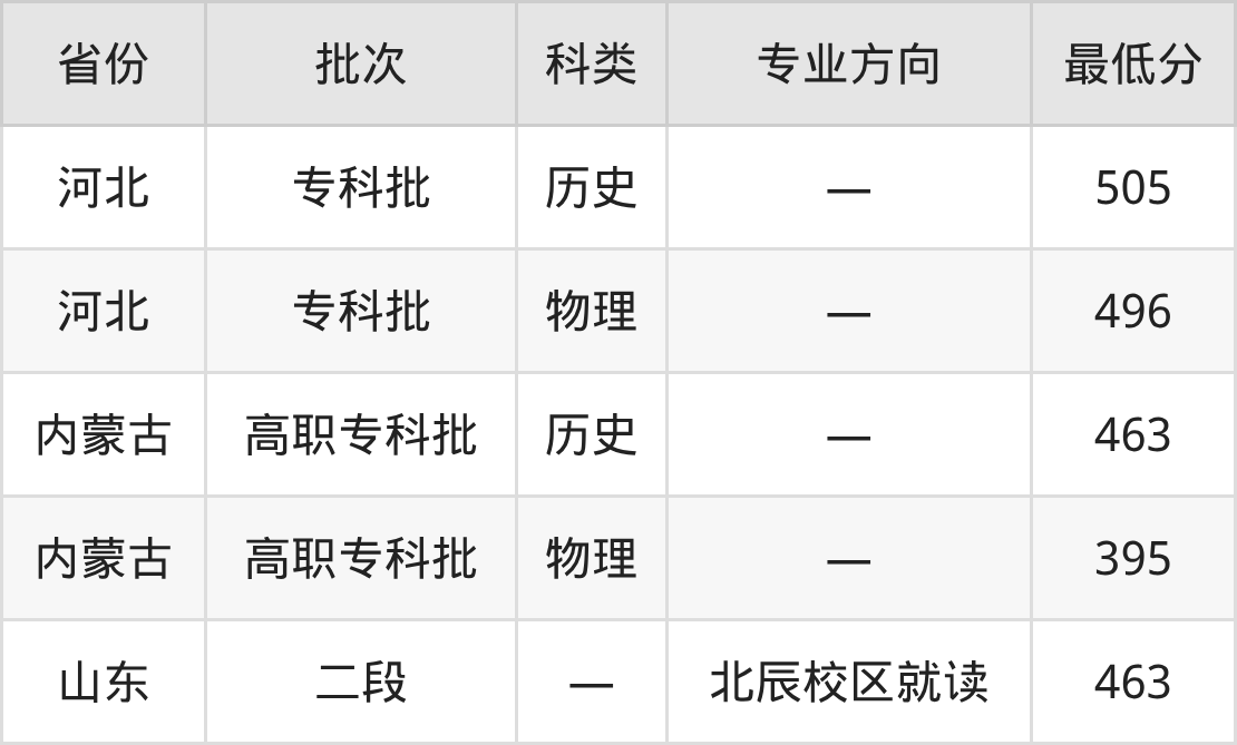 天津市职业大学现代通信技术专业在全国各省最低录取分数线为395分(内蒙古物理类),除此之外,在其余地区的最低分为河北物理类496分、山东463分,以上数据均为2025年数据,供2026年高考生参考。