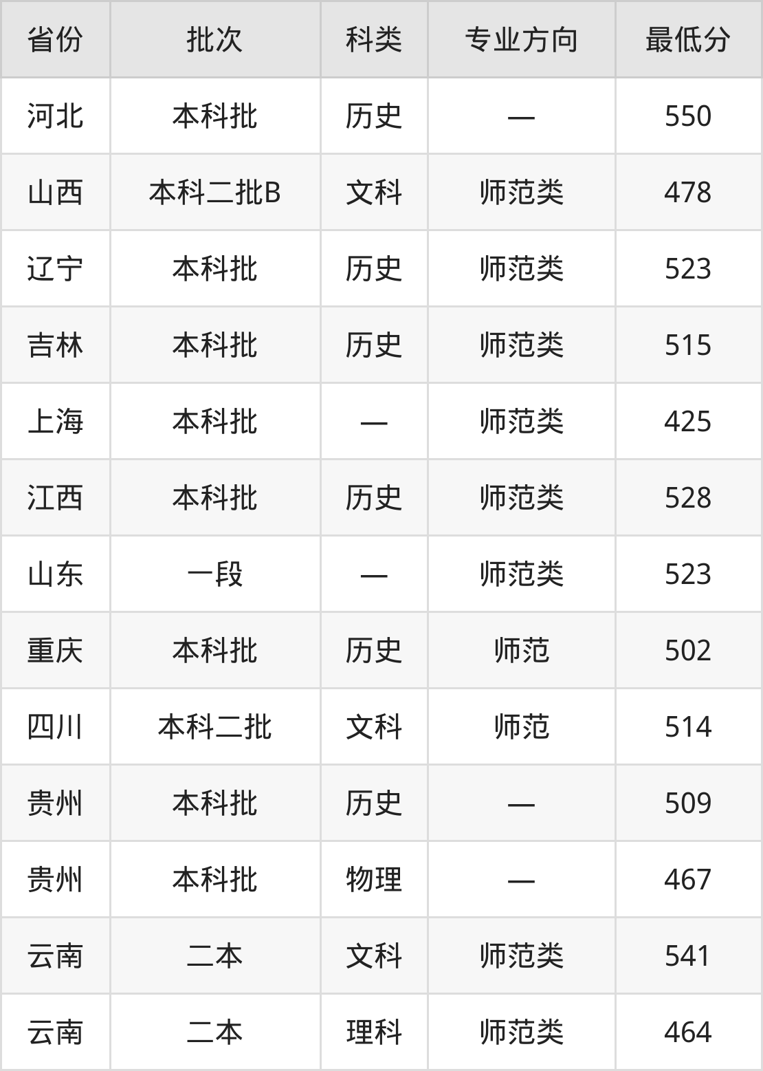 潍坊学院英语专业录取分数线从425分到550分不等,在部分地区的最低分数线如下: