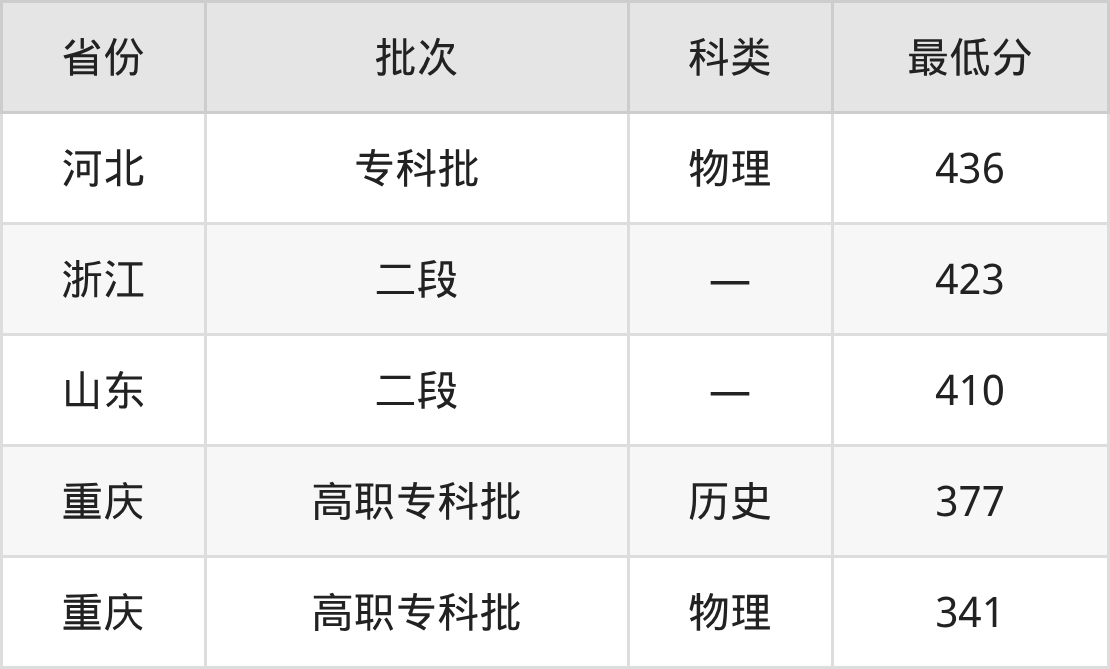 武汉船舶职业技术学院建筑钢结构工程技术专业在全国各省最低录取分数线为341分(重庆物理类),除此之外,在其余地区的最低分为河北物理类436分、浙江423分、山东410分,以上数据均为2025年数据,供2026年高考生参考。