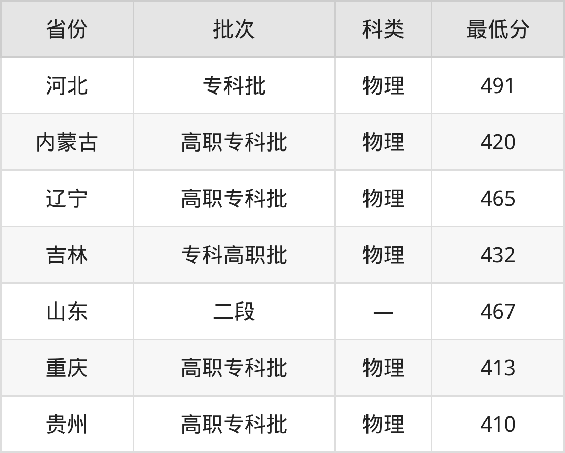 辽宁铁道职业技术学院铁道机车运用与维护专业在全国各省最低录取分数线为410分(贵州物理类),除此之外,在其余地区的最低分为辽宁物理类465分、吉林物理类432分、山东467分、重庆物理类413分等,以上数据均为2025年数据,供2026年高考生参考。