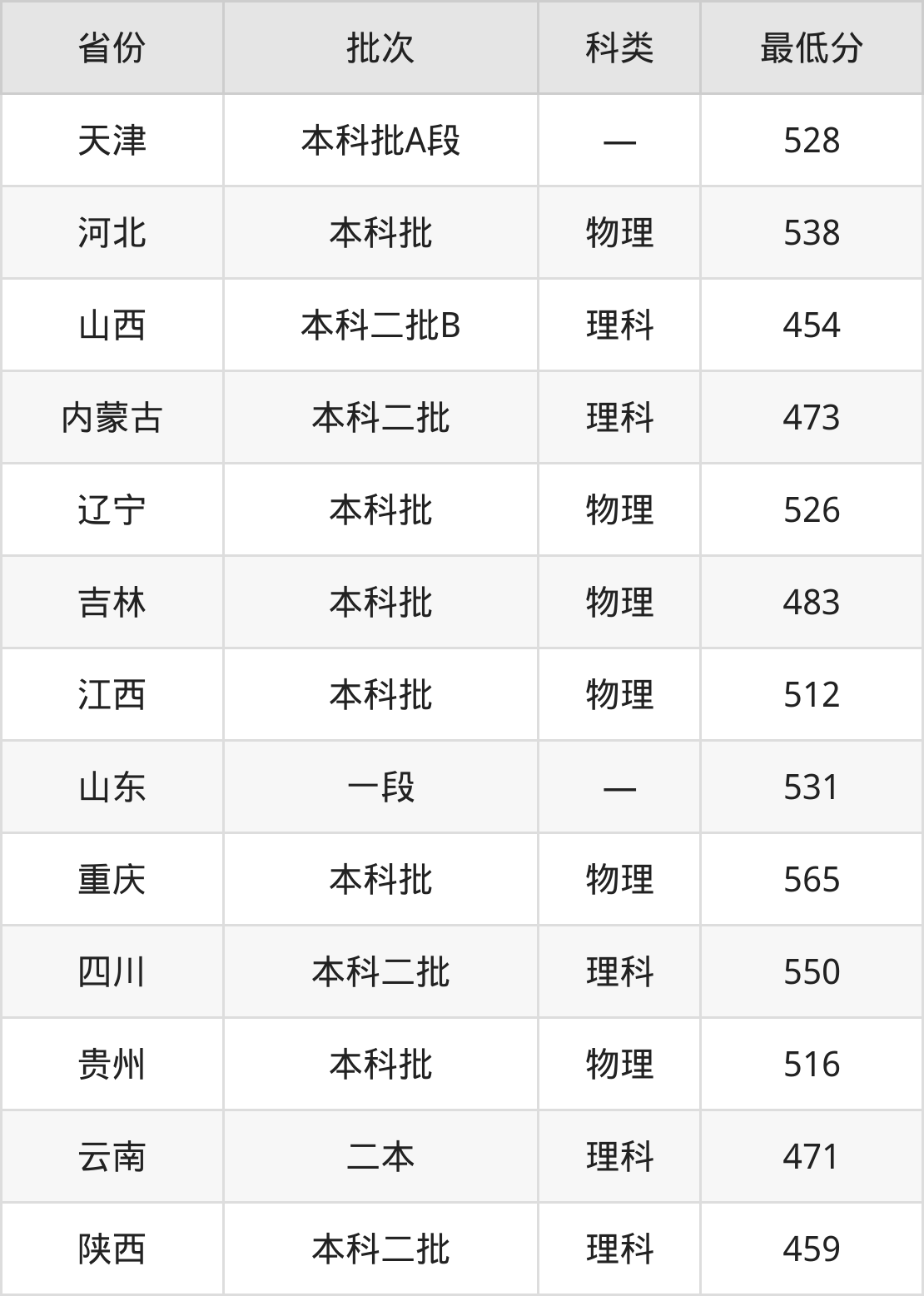 邵阳学院临床医学专业在全国各省最低录取分数线为454分(山西理科),除此之外,在其余地区的最低分为辽宁物理类526分、贵州物理类516分、河北物理类538分、吉林物理类483分等,以上数据均为2024年数据,供2025年高考生参考。