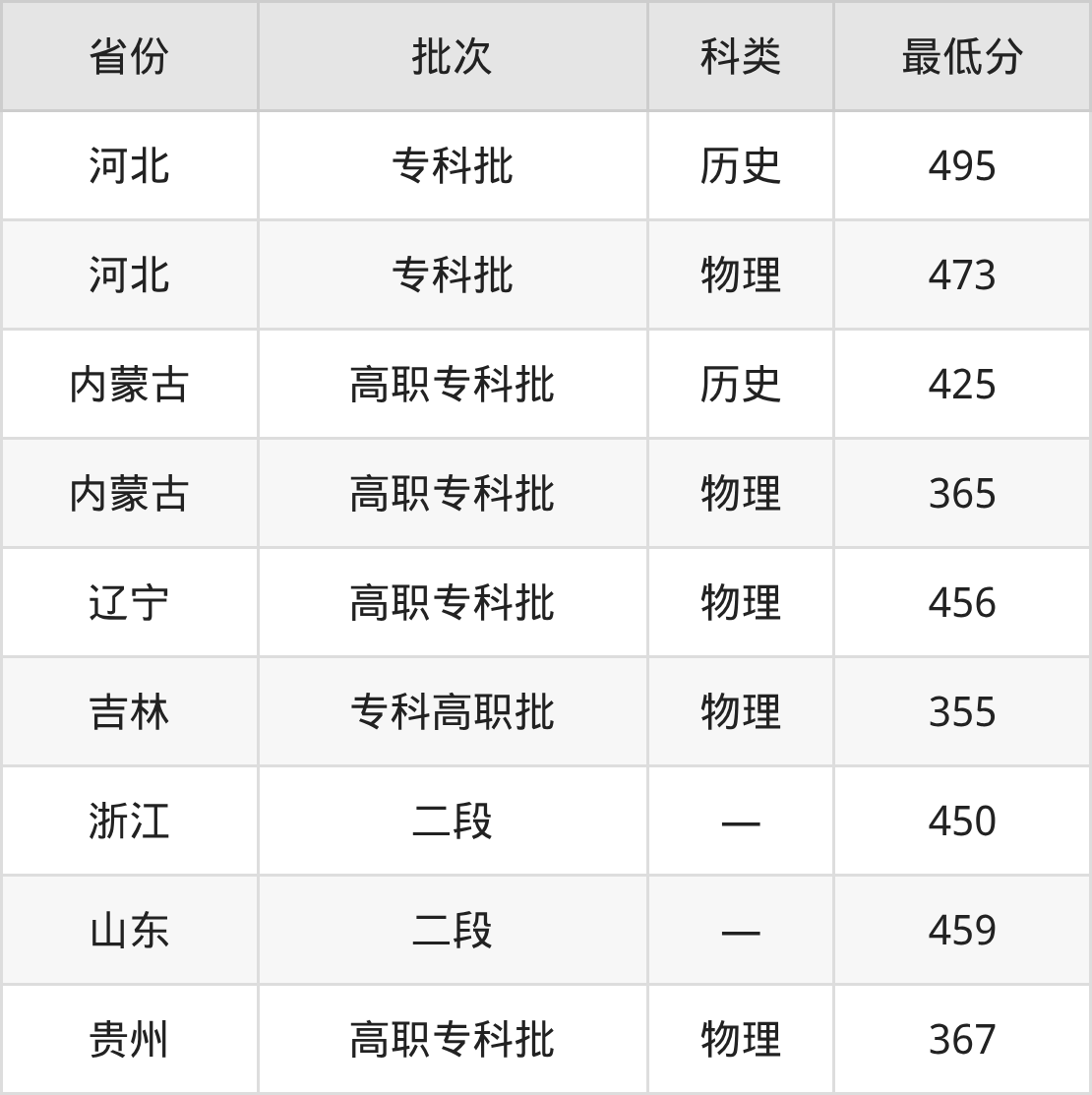 天津商务职业学院大数据与会计专业在全国各省最低录取分数线为355分(吉林物理类),除此之外,在其余地区的最低分为浙江450分、山东459分、贵州物理类367分、河北物理类473分等,以上数据均为2025年数据,供2026年高考生参考。