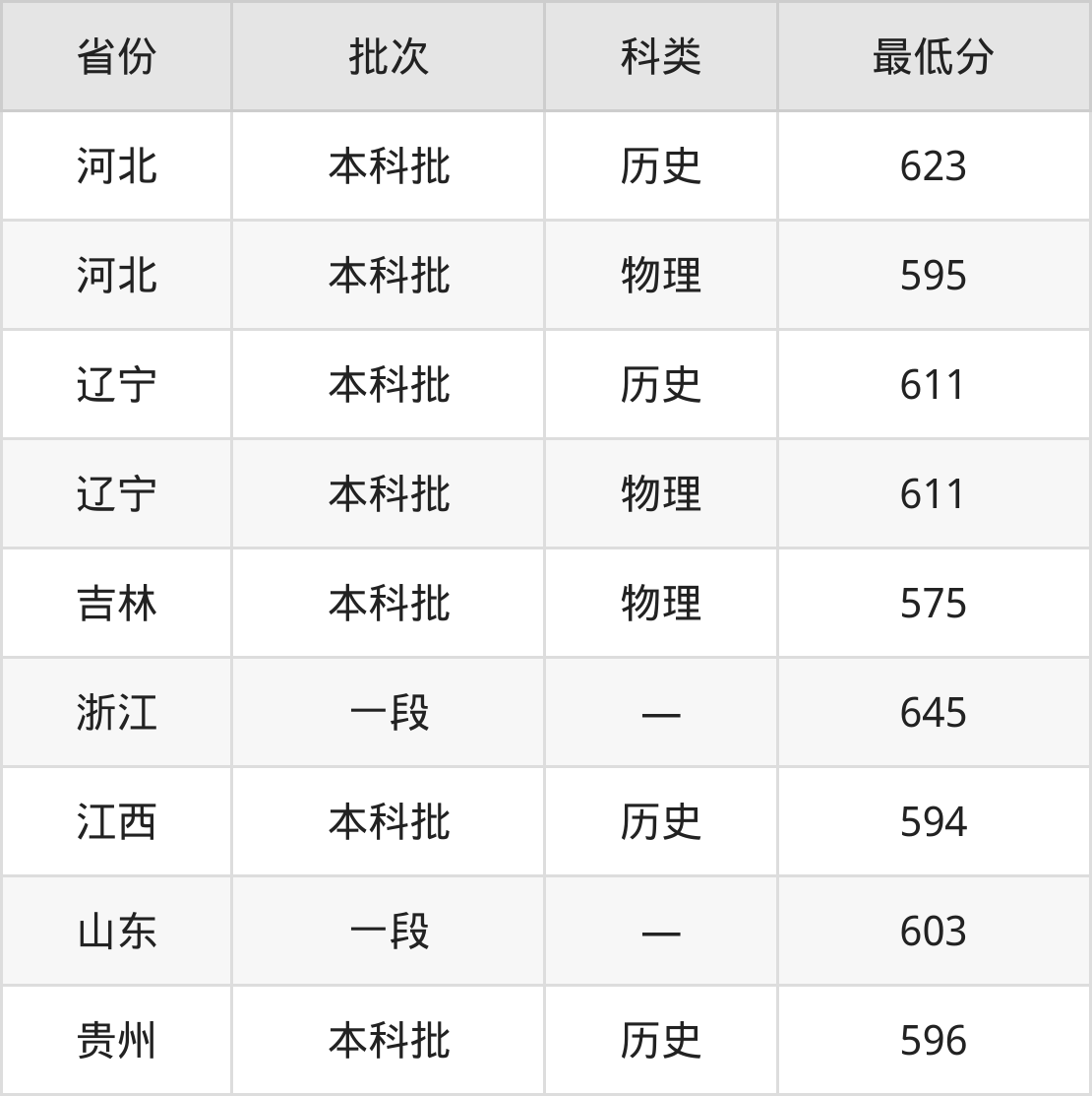 辽宁大学纪检监察专业在全国各省最低录取分数线为575分(吉林物理类),除此之外,在其余地区的最低分为浙江645分、江西历史类594分、山东603分、贵州历史类596分等,以上数据均为2024年数据,供2025年高考生参考。