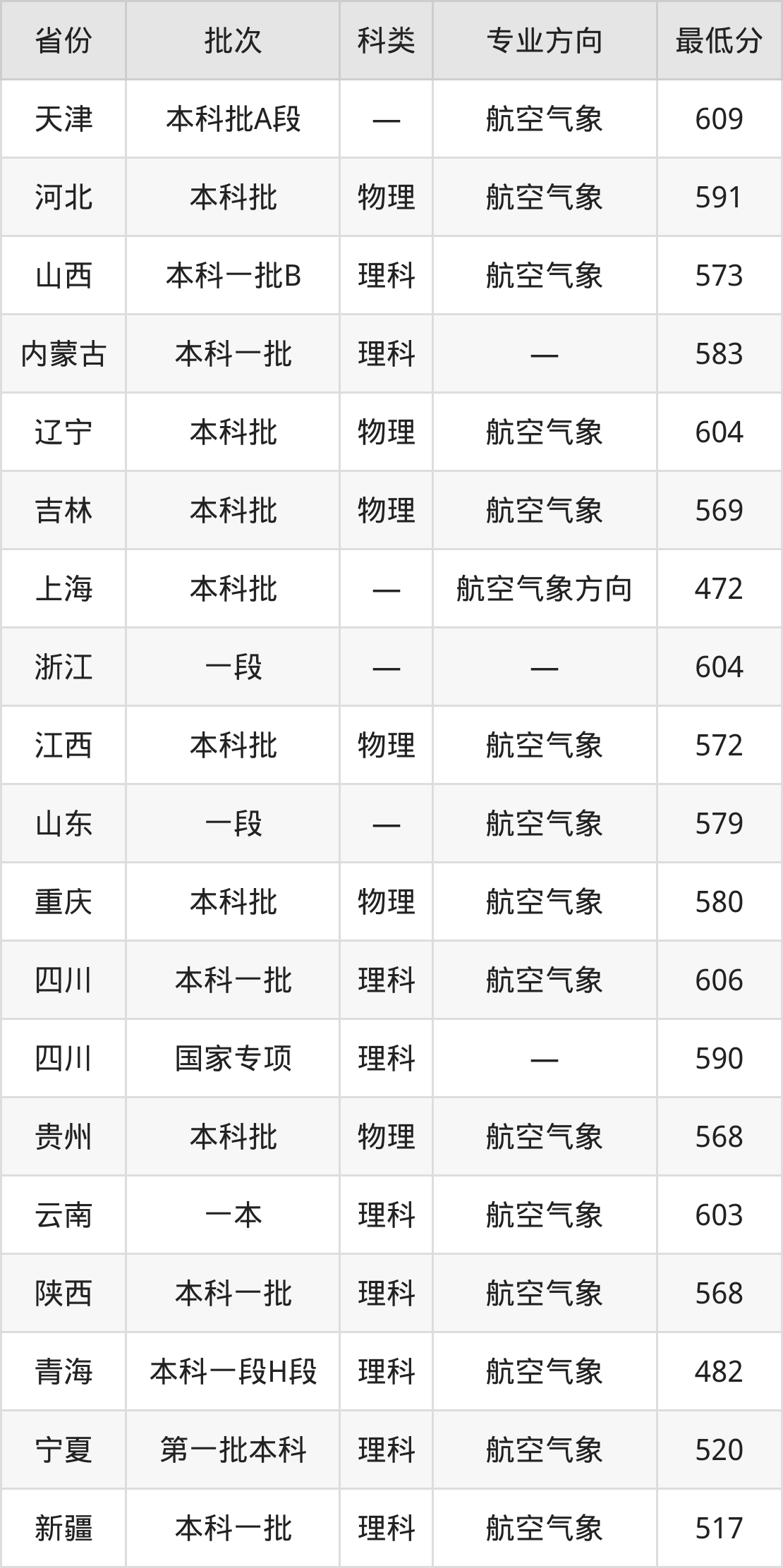 中国民航大学应用气象学专业在全国各省录取分数线: