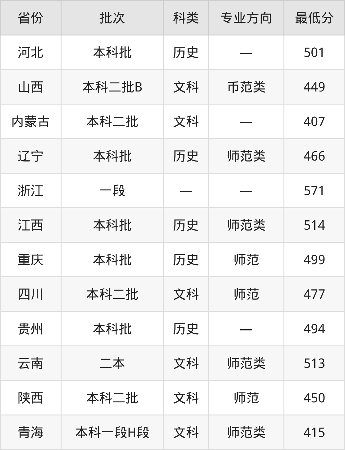 琼台师范学院学前教育专业录取分数线从407分到571分不等,在部分地区的最低分数线如下:
