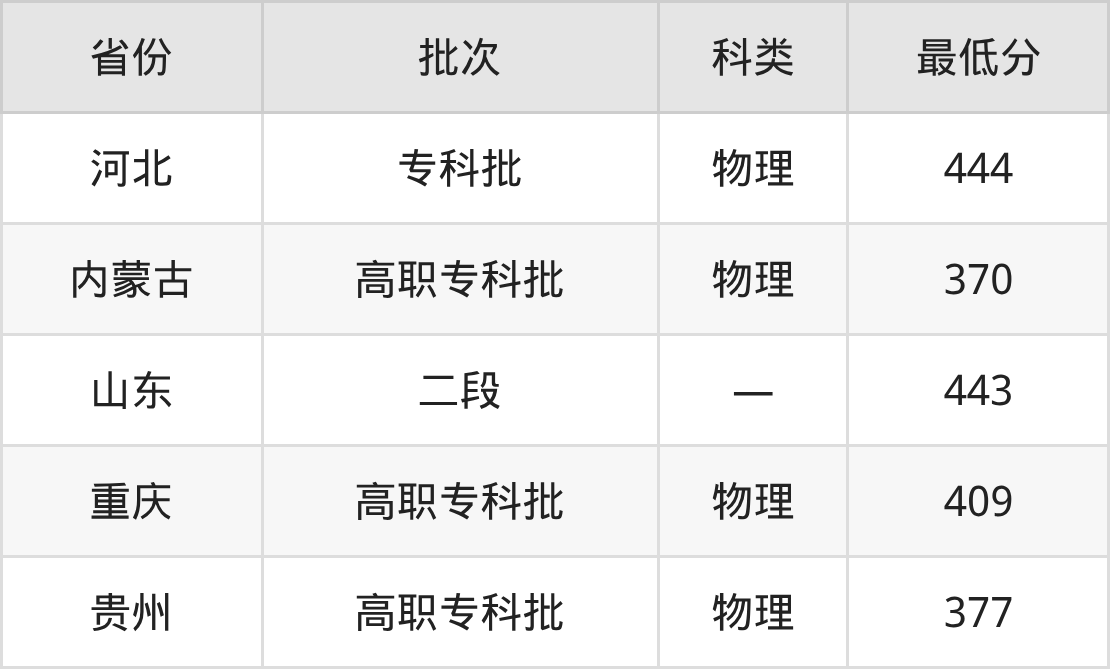 濮阳医学高等专科学校临床医学专业录取分数线从370分到444分不等,最低分数线如下: