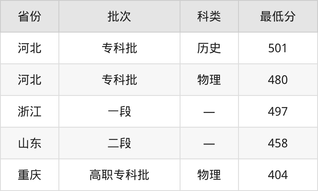 天津铁道职业技术学院铁路物流管理专业在全国各省最低录取分数线为404分(重庆物理类),除此之外,在其余地区的最低分为河北物理类480分、浙江497分、山东458分,以上数据均为2025年数据,供2026年高考生参考。