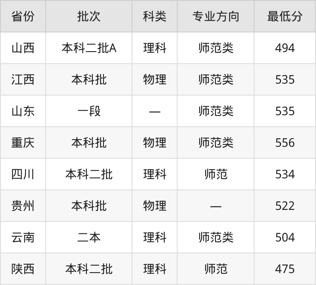 湖北师范大学物理学专业录取分数线从475分到556分不等,最低分数线如下: