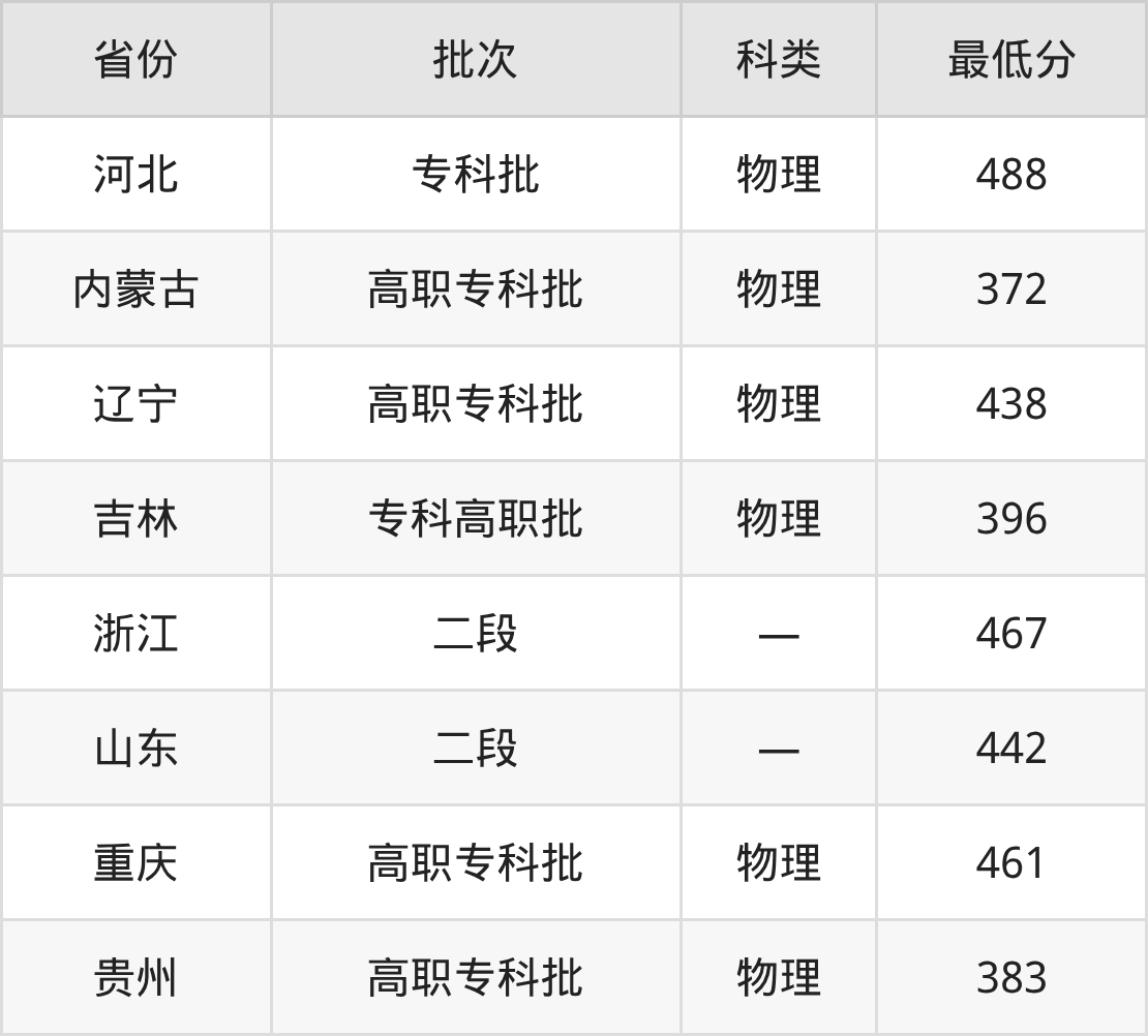 天津医学高等专科学校护理专业在全国各省最低录取分数线为372分(内蒙古物理类),除此之外,在其余地区的最低分为吉林物理类396分、浙江467分、山东442分、重庆物理类461分等,以上数据均为2025年数据,供2026年高考生参考。