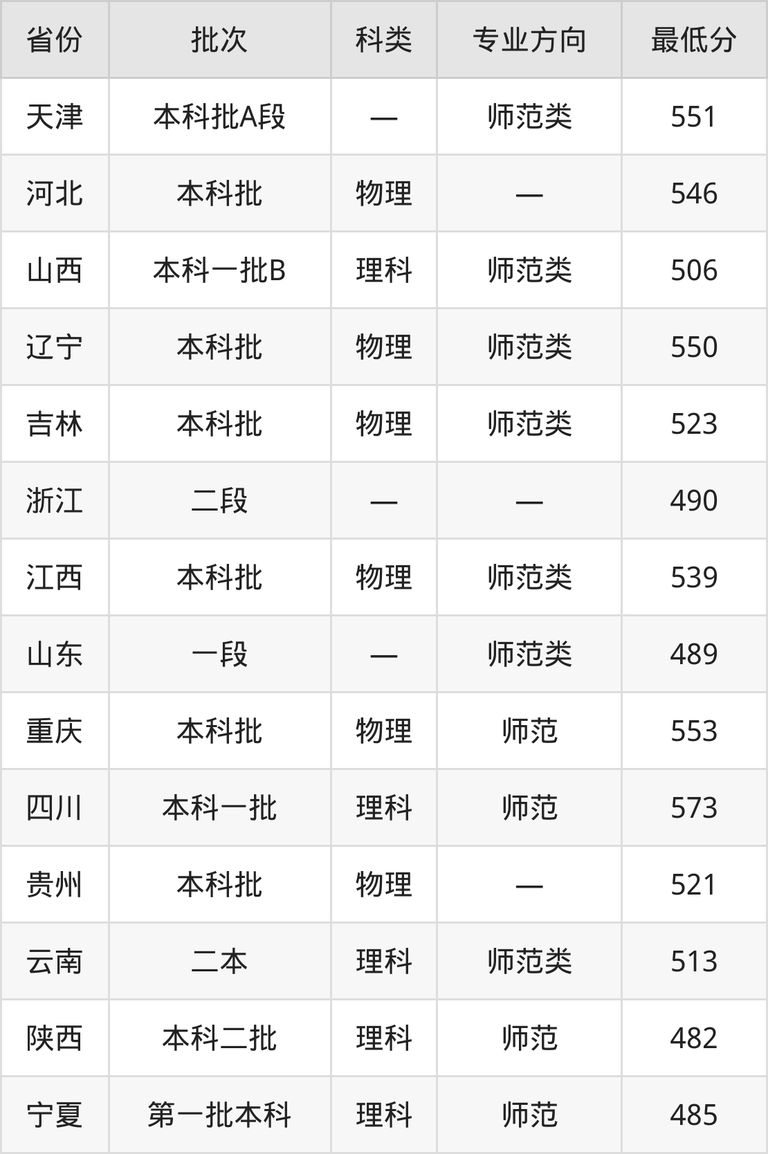 西北师范大学生物科学专业在全国各省最低录取分数线为482分(陕西理科),除此之外,在其余地区的最低分为重庆物理类553分、四川理科573分、贵州物理类521分、山西理科506分等,以上数据均为2024年数据,供2025年高考生参考。