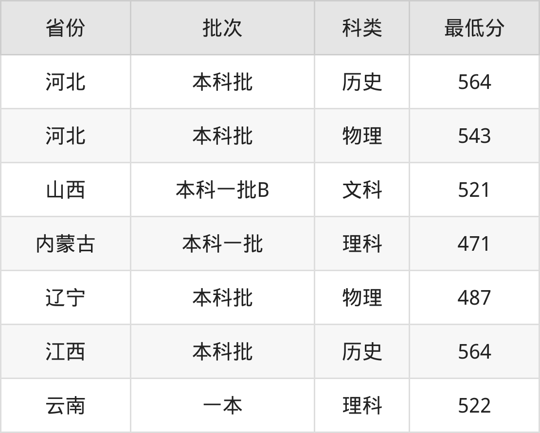 河北大学旅游管理专业在全国各省最低录取分数线为471分(内蒙古理科),除此之外,在其余地区的最低分为河北物理类543分、山西文科521分、辽宁物理类487分、江西历史类564分等,以上数据均为2024年数据,供2025年高考生参考。