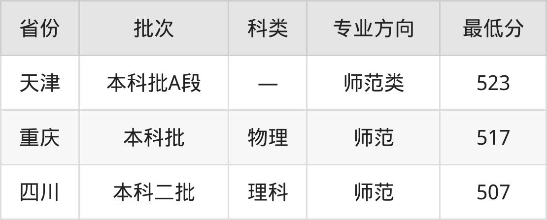 广西科技师范学院小学教育专业录取分数线从507分到523分不等,最低分数线如下: